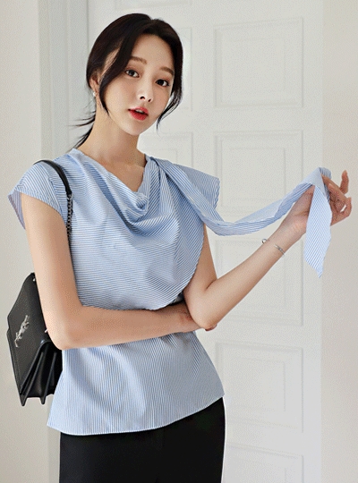 유니크 언발 드레이핑 스트라이프 블라우스