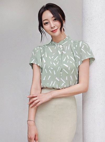 스틱 패턴 윙소매 진주 블라우스