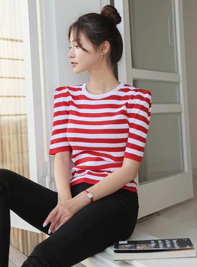 엣지 숄더 스트라이프 니트티