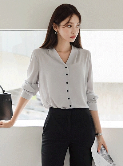 모던 블랙버튼 핀턱 브이넥 블라우스