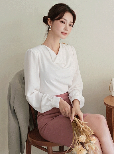 글램 드레이핑 진주버튼 카울넥 블라우스