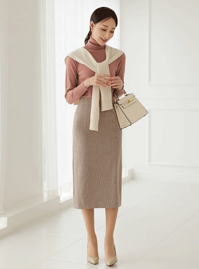 셰퍼드체크 사이드 버튼 스판 미디스커트