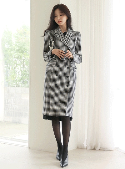 더블버튼 하운드투스 패턴 벨티드 원피스 자켓