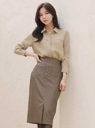 포켓 절개 슬림 H라인 레더 스커트
