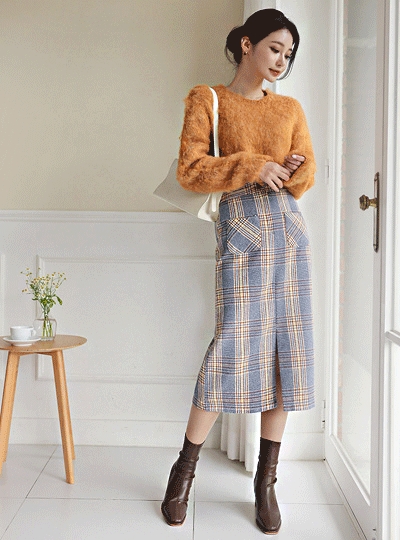 울 타탄체크 백밴딩 포켓 슬릿 미디스커트