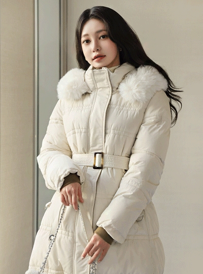 배색 포인트 에코퍼 후드 퀼팅 롱패딩