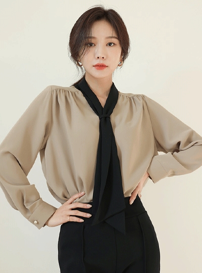 배색타이 숄더셔링 블라우스