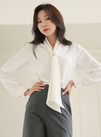 럭셔리 플리츠 스카프넥 브로치 블라우스