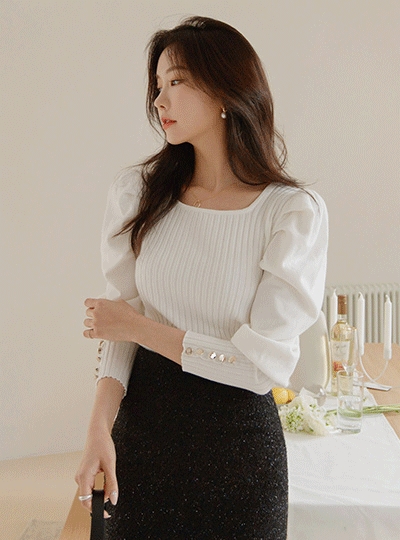 골드 버튼 포인트 퍼프 숄더 골지 니트