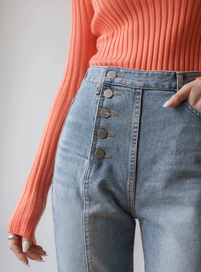 언밸런스 사이드 버튼 부츠컷 데님 팬츠