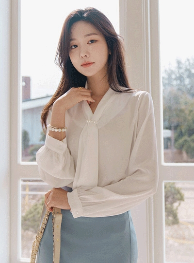 클래식 진주 포인트 살랑 타이 블라우스