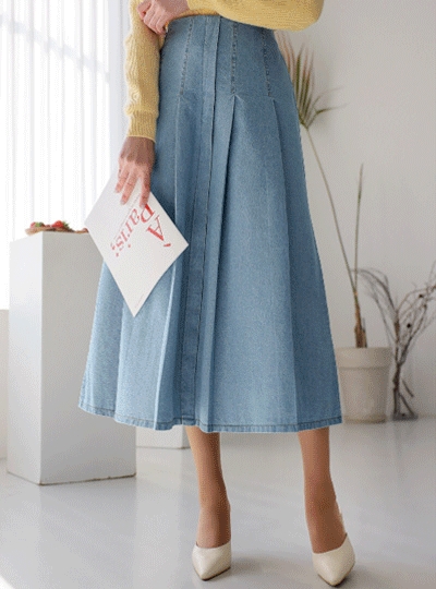 와이드 플리츠 데님 하이웨스트 스커트