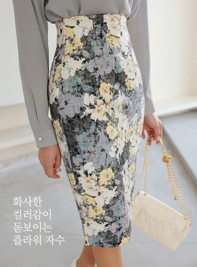 플라워 자수 자카드 하이웨스트 스커트