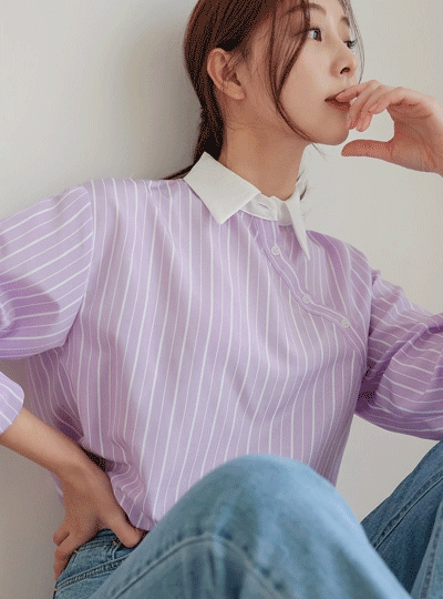 사선 버튼 배색 카라 스트라이프 셔츠