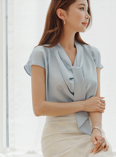 찰랑찰랑 글로시 모달 캡소매 타이 블라우스