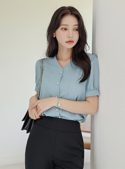 진주 버튼 퍼프 소매 브이넥 블라우스