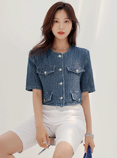 멋스러운 데님 트위드 텍스쳐 크롭 자켓
