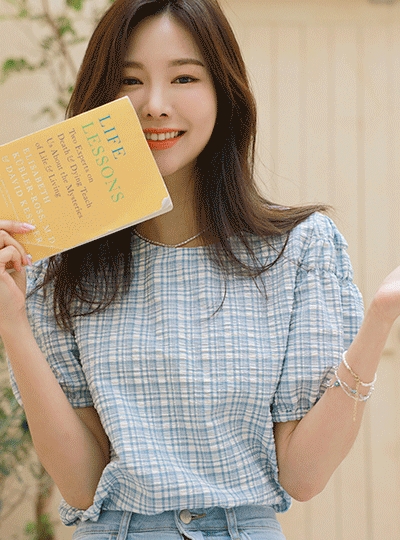 파스텔 체크 패턴 러블리 소매 셔링 와플 블라우스