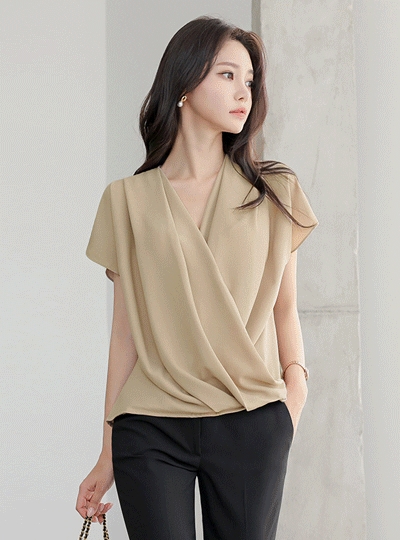 트임넥 핀턱 셔링 퍼프 소매 블라우스