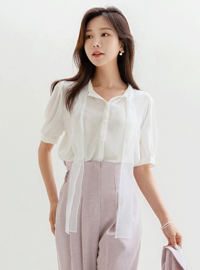 로맨틱 시스루 리본 타이 포인트 블라우스
