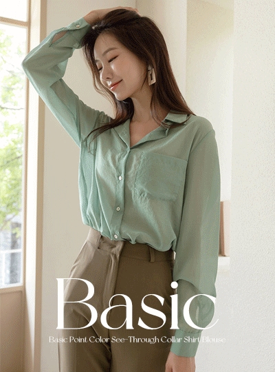 베이직 포인트 컬러 시스루 카라 셔츠 블라우스