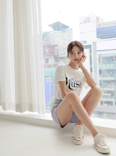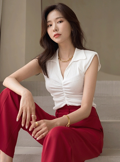 트렌디한 셔링 브이넥 숄더 패드 카라 티셔츠