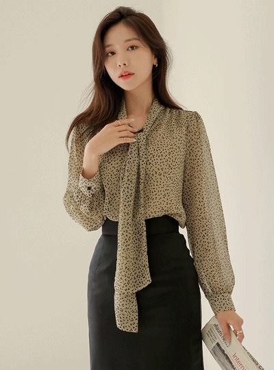 잔잔한 레오파드 타이넥 쉬폰 블라우스