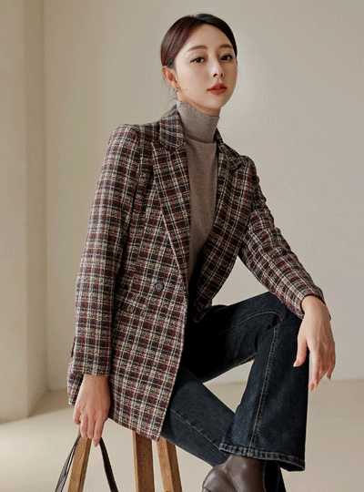 멀티 컬러 체크 더블버튼 하프 자켓